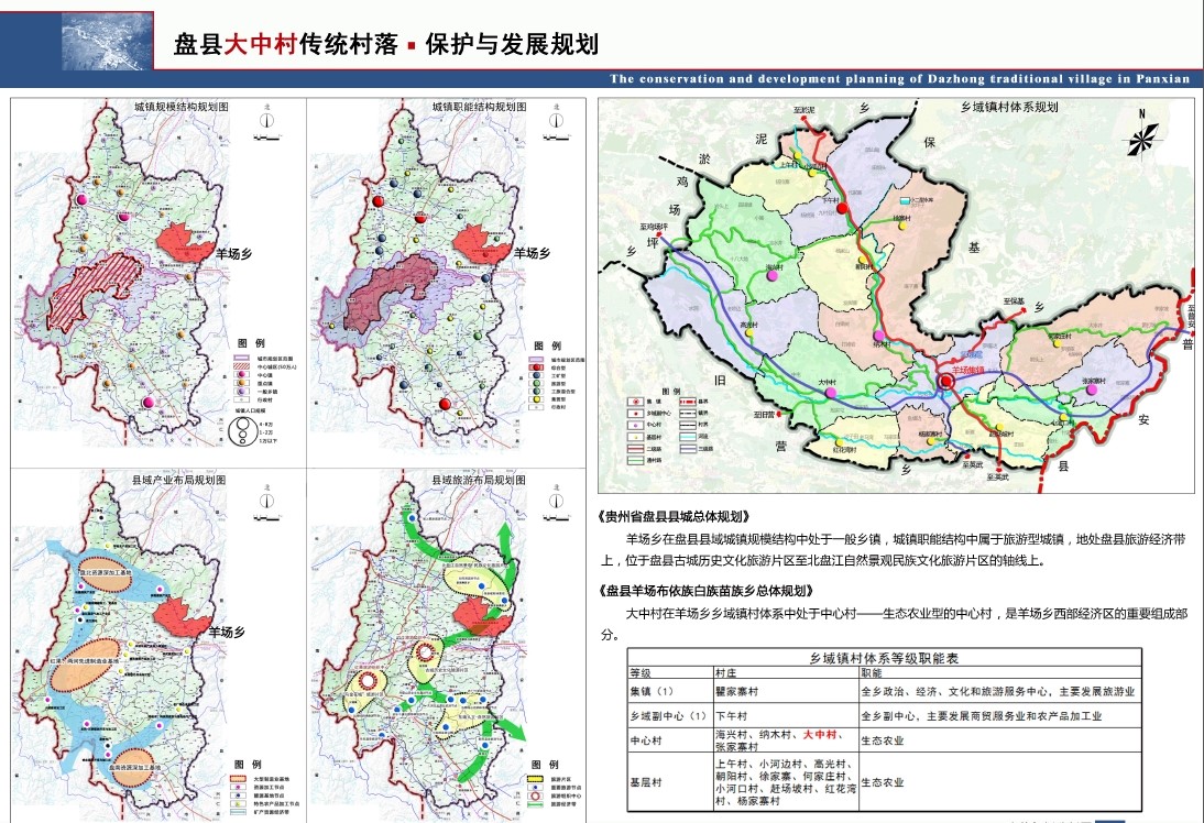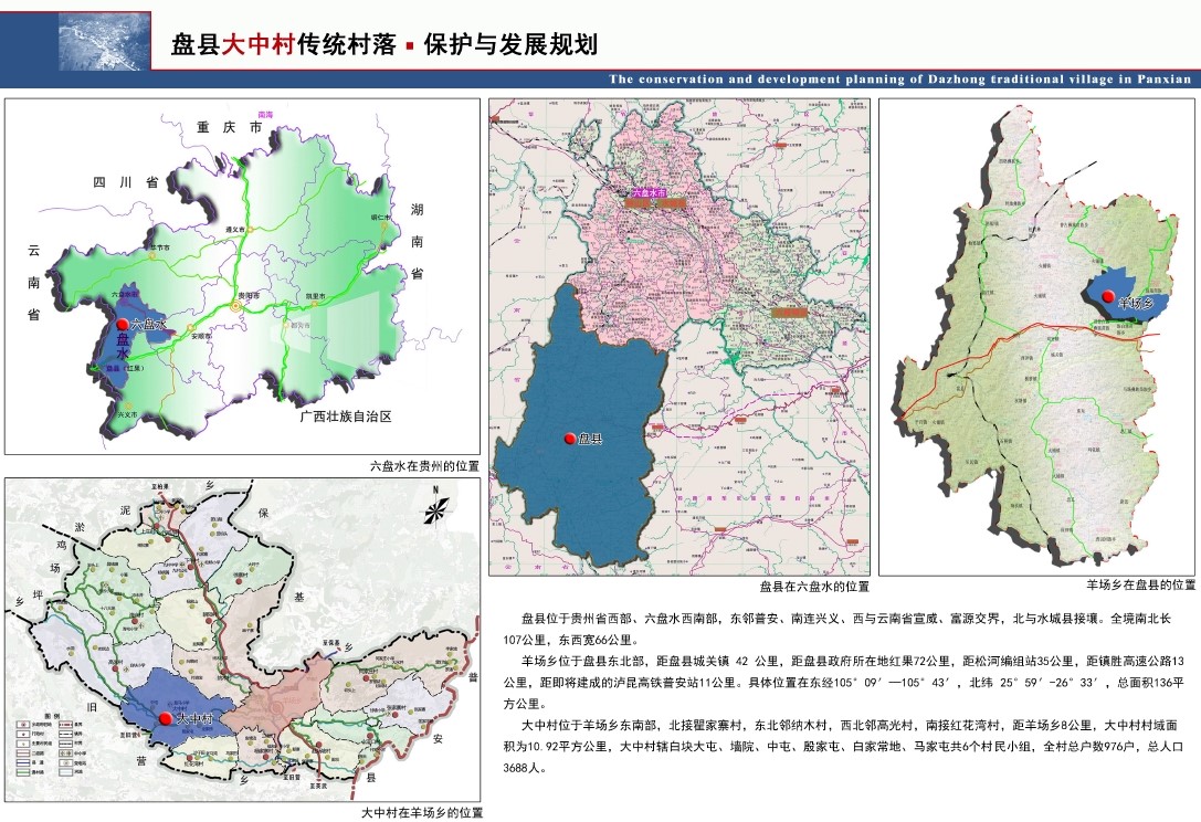 本次规划的贵州盘县羊场布依族白族苗族乡大中村,即是被列入第三批中国传统村落目录的村落之一。与大中村同时被列入的盘县境内的传统村落还两个:盘县石桥镇妥乐村和盘县保基苗族彝族乡陆家寨村。