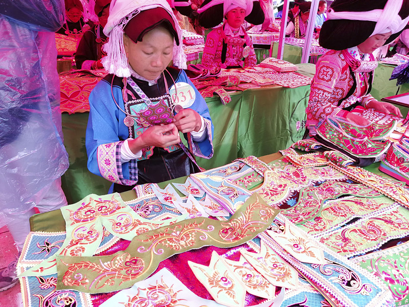 7月7日,2017年中国凉都消夏文化节系列活动之——凉都锦绣坊·百佳绣娘手工技艺展演赛在六盘水市三线博物馆举行,来自六盘水市各县(区、市)的100名绣娘参加了本次展演赛。盘州市推选了30名绣娘参加本次比赛,其中袁春莲、毛米奎喜获十佳绣娘称号,王升丽、岑敏等14名绣娘获优秀绣娘称号。 (朱静 摄)