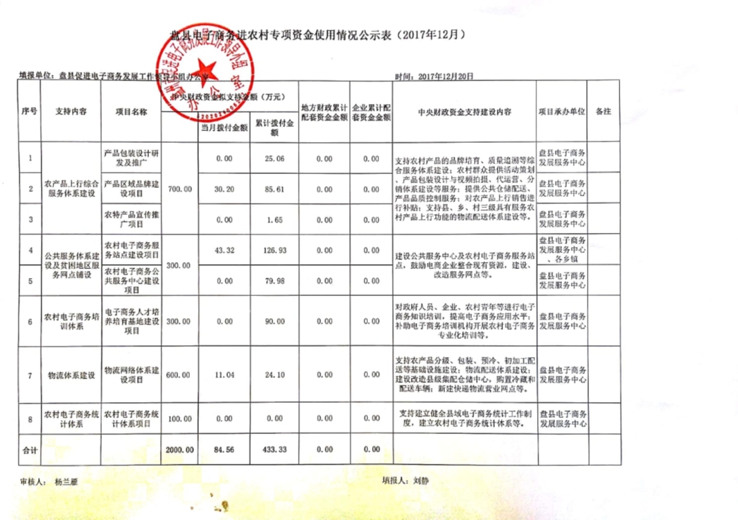 盘县电子商务进农村专项资金公示表(2017年12月)