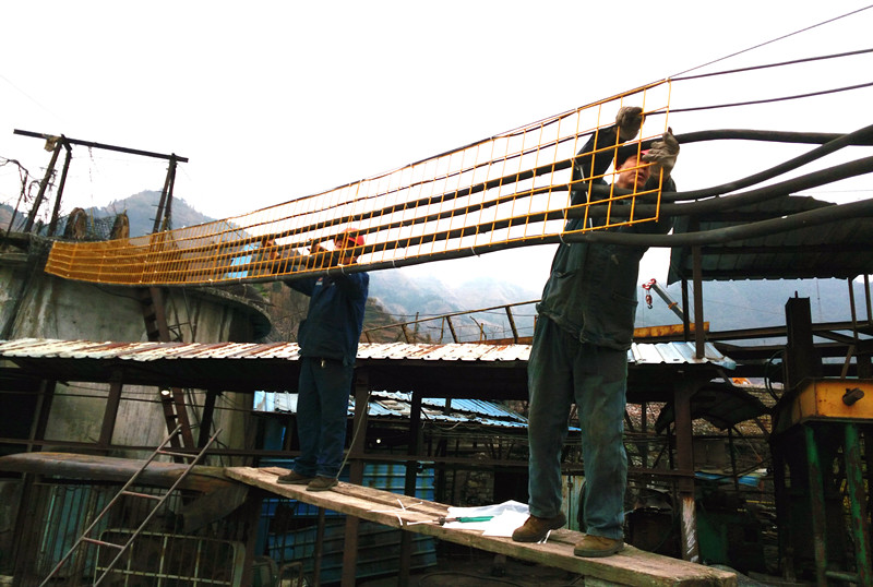 盘江精煤公司山脚树矿运输区不断加强地面环境整治,严格按照质量标准化要求采用钢筋网吊挂电缆,为职工创造良好的工作环境。图为职工在吊挂电缆。