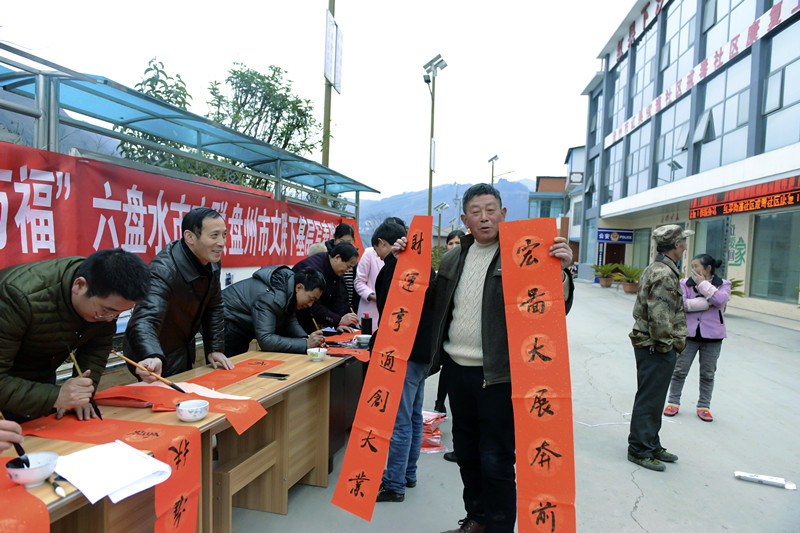 1月9日,六盘水市文联、盘州市文联组织部分书画家协会会员、书法爱好者到盘州市各乡镇开展“迎新春·送万福”下基层写春联活动。据了解,该活动将覆盖盘州市各村,预计在1月15日前结束。图为红果街道办下沙村活动现场。 ( 邓永长 摄)